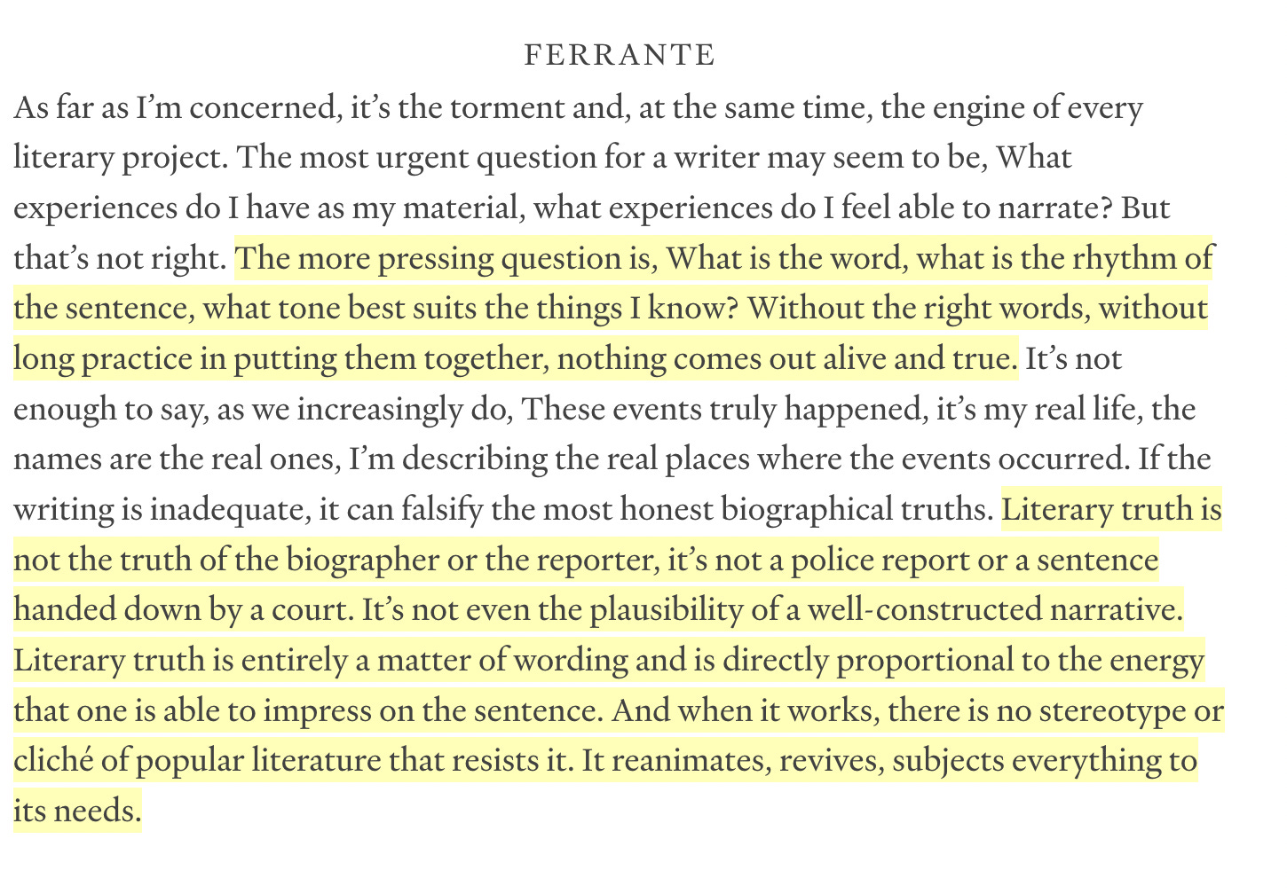 Elena Ferrante for the Paris Review: I have struggled all my life with what it means to tell the truth in my writing and feel that something was said here that alleviated something in me. Which is often, I am finding, what Ferrante’s work does. To the point, it is so clear, you wonder if it is your pen name atop the work of an interview you don’t remember having.